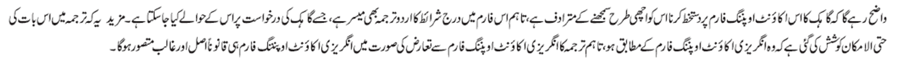 I/We declare and confirm that I/we have received, read and understood the Bank's Terms and Conditions Governing Account(s) which has been signed by me/us in acceptance thereof. I/We agree to observe and be bound by the said ‘Terms and Conditions’ and any changes, supplements or modifications thereto that may be made by the Bank from time to time. Furthermore, I/we acknowledge having received a copy of this Application Form including these Terms and Conditions, with salient features in Urdu.